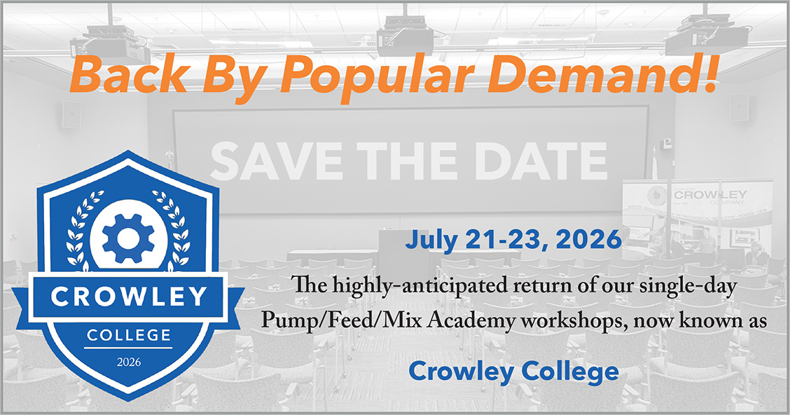 It’s the return of our popular Pump/Feed/Mix Academy, now known as Crowley College! The single-day workshop for municipal water and wastewater operators and maintenance staff will be available on Tuesday, July 21 and Wednesday July 22 (identical program offered each day). We’ve also got something in the works for consulting engineers, contractors, and industrial operators, that will happen on Thursday, July 23.