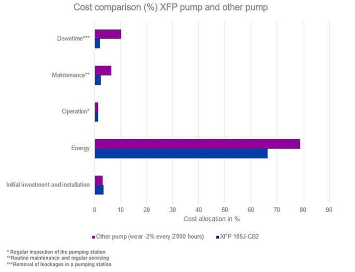 Looking at the overall life cycle costs (LCC) for a pump over a 15-year period, energy costs represent the largest proportion at around 65%, with operation and maintenance accounting for 15%. In the case of wastewater pumps, there is an additional factor that needs to be considered. The pump needs to be designed to minimize the number of blockages that are experienced. Assuming a pump becomes blocked every second month, operational costs to clear the system and expenses for any repairs, consumables and replacement parts, including labor, will represent 15% of the LCC. This can be reduced to less than 5% if the latest design of wastewater impeller is implemented, keeping blockages to a minimum.